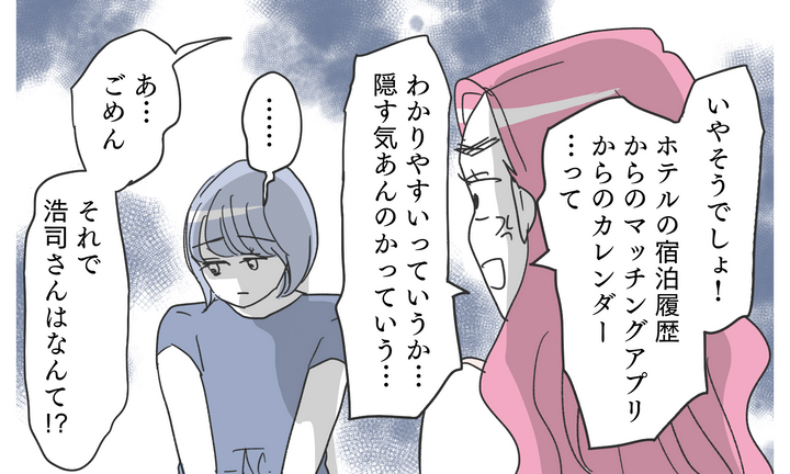 直哉の誕生日会で義母は茜と茜の母を蔑むような発言をする。しかし浩司が義母を制し茜をかばってくれた。やはり浩司を信じたいと思った矢先、共有カレンダーに知らない女性との約束の予定が登録されているのを見てしまう。