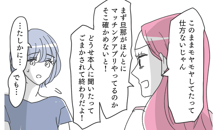 怖くて浩司に言うこともできず、うじうじ悩んでいる私を見て、沙織は半ば強引にアプリへ潜入調査をするように勧めてくれました。きっとこの状態の私では、浩司と対峙したところで言いくるめられて終わるから…と。