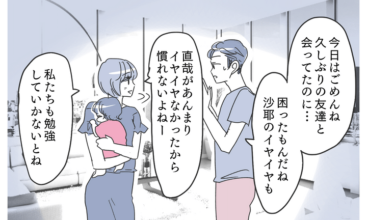 浩司の呼び出しで家に帰ると、沙耶がイヤイヤ発動中でした。浩司も土日に育児はしてくれるものの、やはりイヤイヤ期はなかなか手ごわいようで…しばらく抱っこすると泣きつかれて寝てしまいました。沙織には埋め合わせしないとなぁ…。