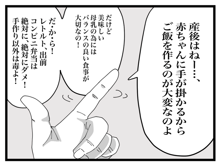 自分のご飯を心配している様子の夫に、今はネットスーパーもあるし、レンジ調理のおかずもたくさんあると伝えると、「手作りじゃないと母乳がまずくなるんだろ?」と義母から聞いた言葉を鵜呑みにしているようで…。