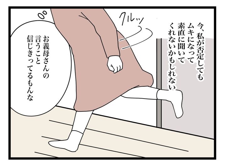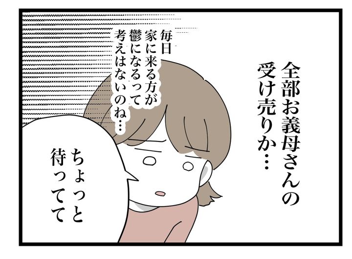 むしろ、体も心も不安定な時期だからこそ、無理のない範囲で生活するべきなのに…。義母が正しいと信じる「育児論」のせいで、今まさに妻が辛い思いをしているということを夫に理解して欲しい。
