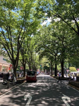 けやき並木通りには、車道の両脇に立派なけやきの木が立ち並んでいます。木漏れ日から入ってくる光はとても綺麗で、行き交う方達の憩いの場ともなっているようです。