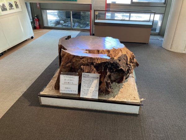 ふるさと府中歴史館には樹齢270年のけやきの切り株の標本が飾られています。これは馬場大門のけやき並木にあった大きなけやきの古木が枯死した時のものだそうです。