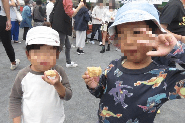 おやつを食べる事が出来て、子供達は大喜びでした。我が家は開始時刻早々に公園に着き、すぐ試食列に並んで頂く事が出来ましたが、開始30分も経たずに数量に達していました。