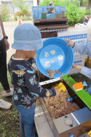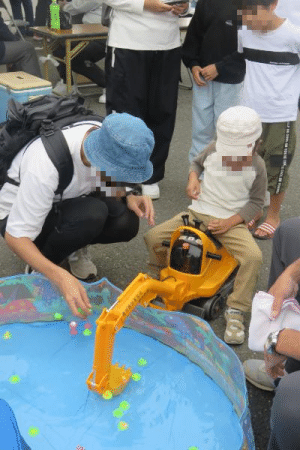 子供が乗って操縦する事が出来るミニチュア重機で、ビニールプール内の景品をすくいあげる体験が出来ました。