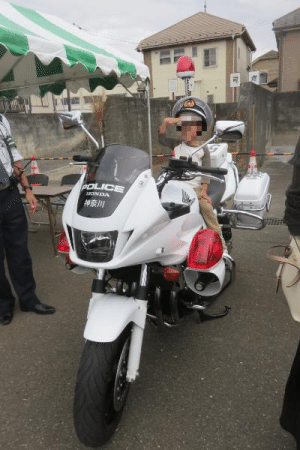 今回は白バイに乗せて頂きました。帽子もお借りし、白バイ隊員の方に直接敬礼を教えて頂いてからの記念撮影で、カッコ良く決まりました。