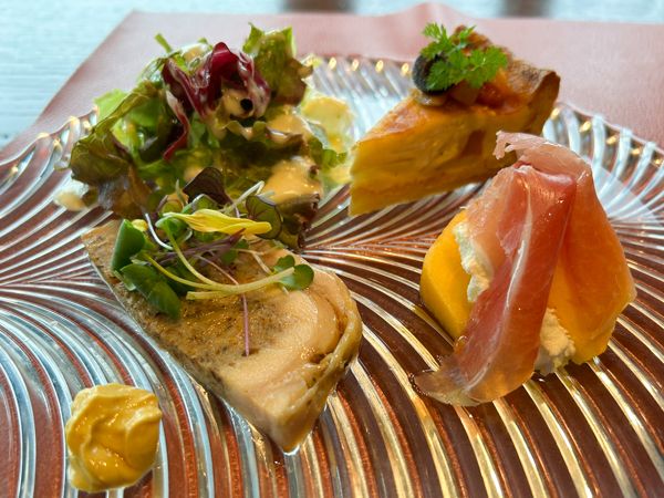 ポルチーニ茸とベーコンのキッシュ、柿と生ハムとクリームチーズ、鶏のテリーヌ、付け合わせにサラダ。