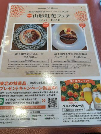 今回は「山形紅花フェア」のメニューでしたが、通常のランチメニューだとサラダとスープがセットになり、パスタランチ2,000円、ハンバーグランチ2,500円とのこと。また、事前にランチセットを予約した場合、通常1,000円のデザートセットがサービスになるそうです!