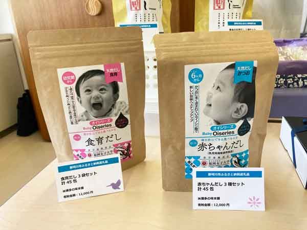左から食育だし3袋セット、赤ちゃんだし3種セット(いずれも寄付金額12,000円)