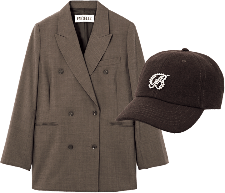 左から:ハンサムなダブル仕様ながら柔らかなモカブラウンで上品な印象に。ジャケット¥39,600(エモエレ/アダム エ ロペ)、カジュアル過ぎず◎。キャップ¥26,400(マディソンブルー)