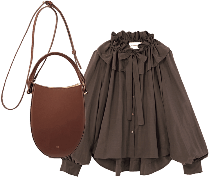 左から:ユニークなフォルム。バッグ¥28,600(パフト/アダム エ ロペ)、ブラウンならフリルだって甘さ控えめ。ブラウス¥26,950(イウエン マトフ/ユナイテッドアローズ 渋谷スクランブルスクエア店)