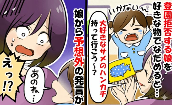 次女が登園を拒否するようになってから半年。このままではいけないと思い、私は幼稚園に行きたくなるよう、次女の大好きなジンベイザメの力を借りることに。さっそくジンベイザメのハンカチやキーホルダーを買って、朝持たせてみますが変化なし……。