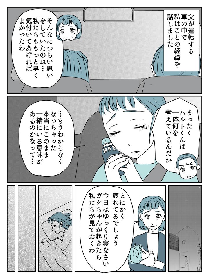 その顔を見た瞬間、張り詰めていた何かがプツンと音を立てて切れ、またもや泣き出してしまいました。母は私と息子を優しく抱きしめます。父も心配そうな表情で見ています。