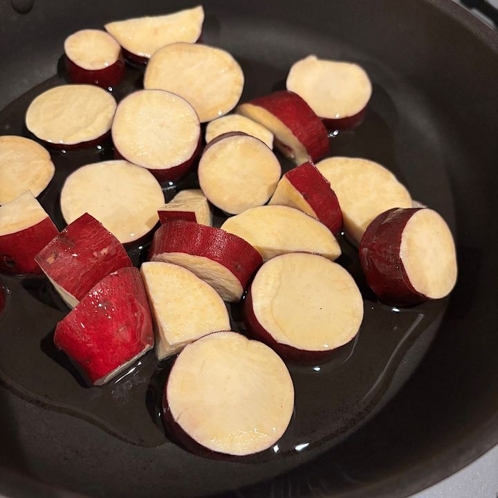 ②フライパンにさつまいもを入れ、サラダ油をさつまいもが少しだけ浸るぐらい入れて揚げ焼きのようにします。