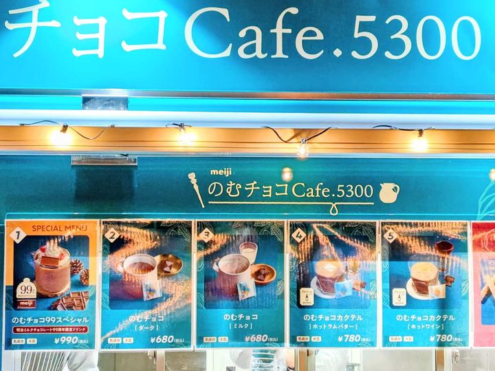 フードトラックで登場している「meiji のむチョコ Cafe.5300」。明治ミルクチョコレート99周年限定ドリンク「のむチョコ99スペシャル」(税込990円)、「のむチョコ(ダーク・ミルク)」(各税込680円)など、大人を魅了するチョコレートメニューがそろっています。