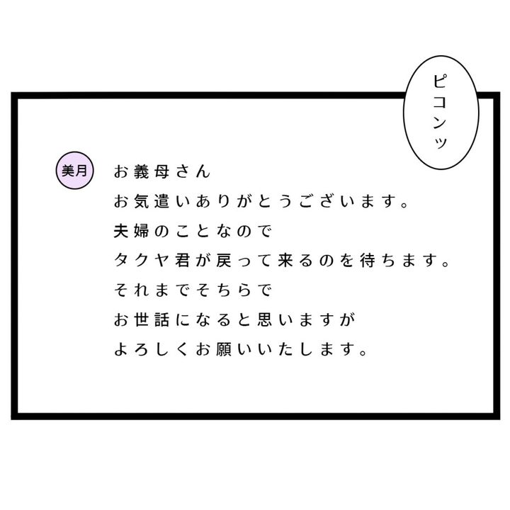 「お義母さん、お気遣いありがとうございます。夫婦のことなので、タクヤ君が戻って来るのを待ちます。それまでそちらでお世話になると思いますがよろしくお願いいたします」