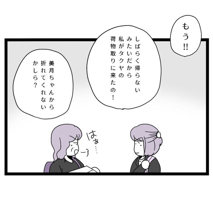 「俺の両親と仲良くしようって思わんの?」そう言って家を出て行た後、帰って来なくなったタクヤさん。そんなタクヤさんの代わりに荷物を取りに来たと、勝手に家に入る義母を見て募るイライラ!美月さん、もう我慢しなくて良いと思います!