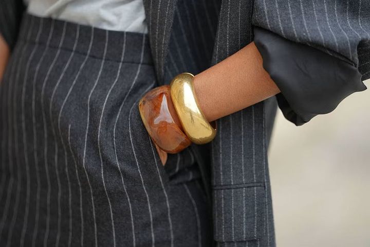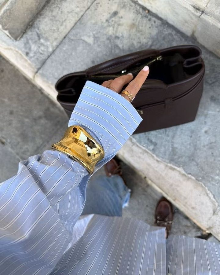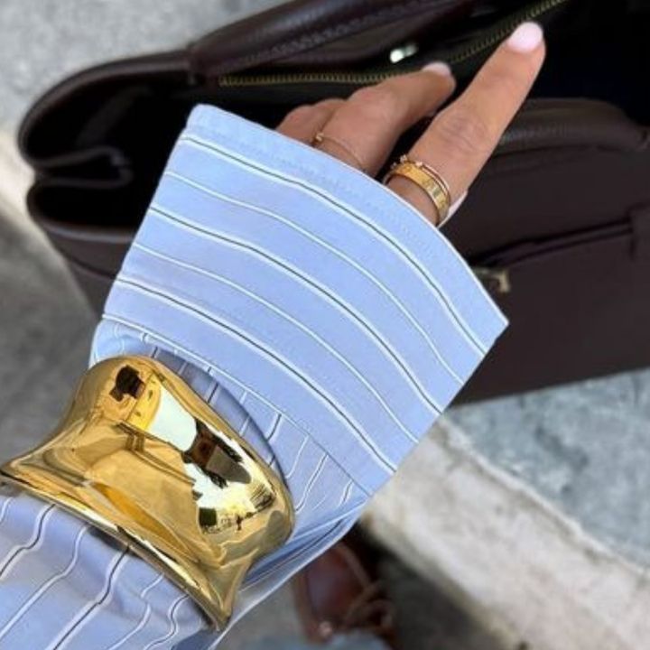 仕立ての良いブルーのシャツや柔らかなシルクブラウスに、幅広のゴールドや彫刻的なシルバーのカフを重ねれば、普段着のワークウェアがまるで雑誌のエディトリアルから飛び出したかのような装いに。
