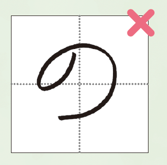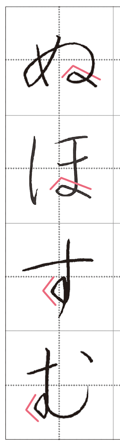 くるっと回す「結び」はひらがな特有の部位。結びには「よ」などの「横結び」と、「す」などの「縦結び」がありますが、どちらも丸くすると幼い印象に。横結びは「へ」、縦結びは「く」をイメージし、少し角をつけましょう。