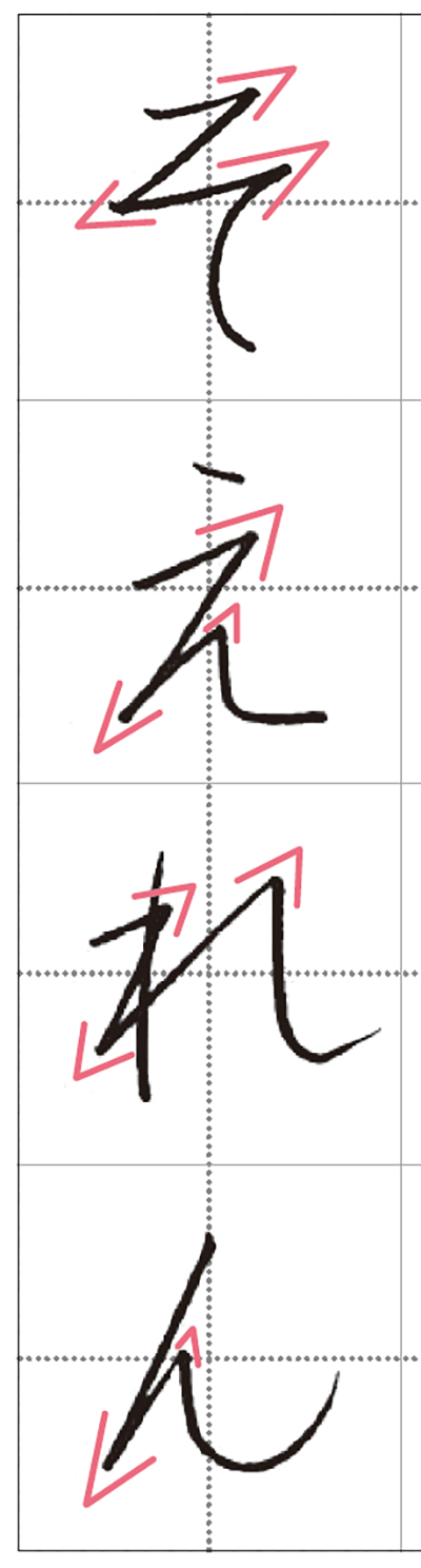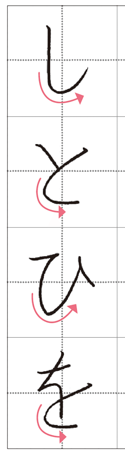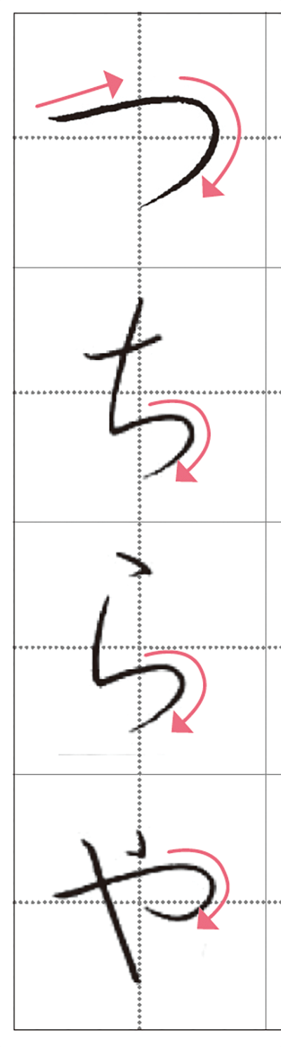 「つ」「や」「ひ」などの曲線は、ひらがなの優美さが際立つところ。曲線を書くときは、右まわりも左まわりでもスピードを落として、ゆっくり回るのが鉄則。