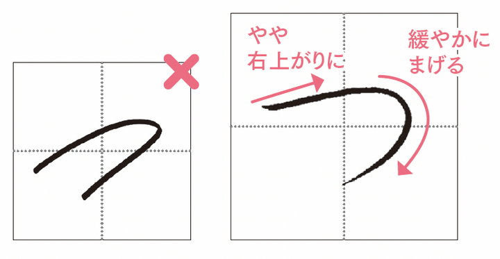 途中でいったん止めて、角度をつけてから、右上がりのカーブをゆっくり書きます。