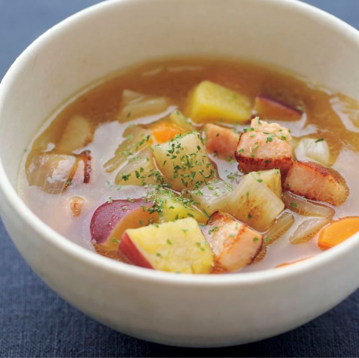 オリーブオイルとにんにくの香りに、だしの風味が合わさった和風ミネストローネ。ごはんにかければ即席リゾットに。野菜もたっぷり、身体に嬉しい一皿です。