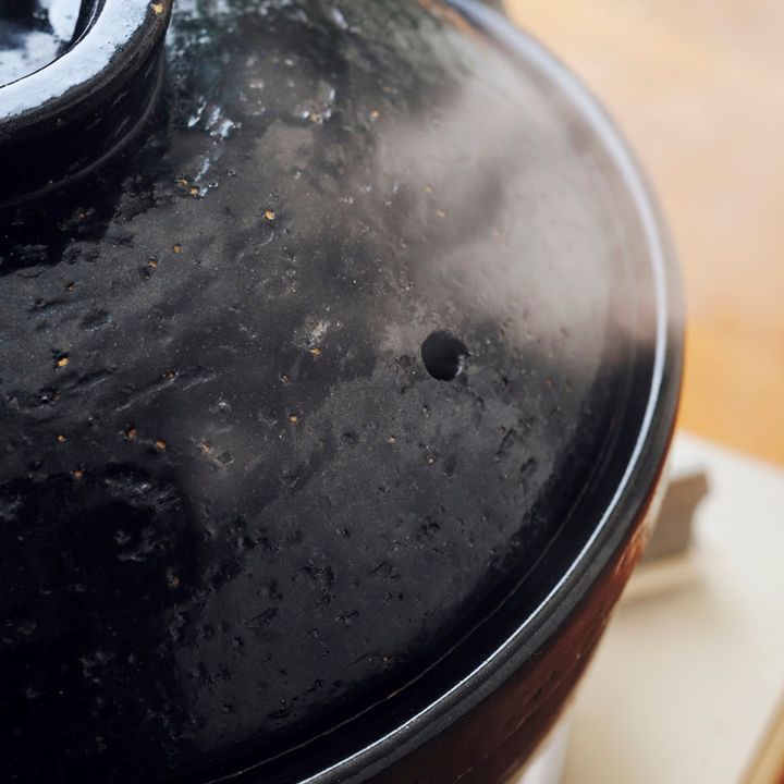 耐久性、保温性にすぐれた萬古焼の土鍋。蒸気の抜け穴がなく、吹きこぼれにくい形なので、火からおろして蒸らしている間に、ごはんに水分がしっかりと浸透してツヤツヤに仕上がる。また、調湿効果があるので、鍋ごと冷蔵庫へ入れたり、おひつ代わりに使用できる。