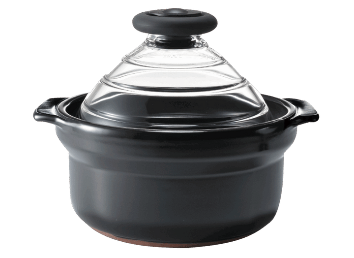 本体は耐熱性にすぐれた萬古焼。釜の肉厚な形状が蓄熱性を高め、失敗なくふっくらごはんに。ドーム状の透明な耐熱ガラスのふたは、吹きこぼれにくく、中の様子が見えて安心。ツマミにホイッスルがついているため、火を止めるタイミングを音で知らせてくれるのもポイント。