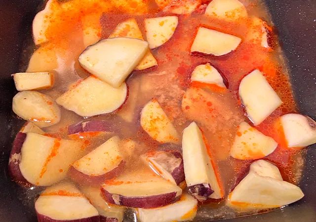 サツマイモに火が通ったら、『麻婆豆腐の素』と水180㎖を加えて、中火にかけてください。