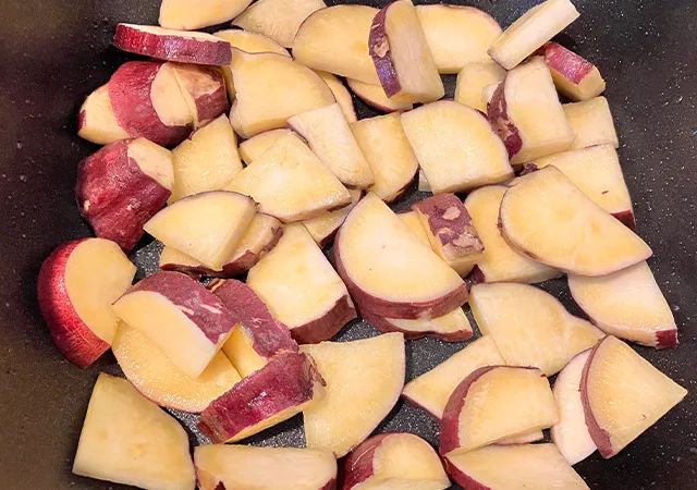 油を引いたフライパンにサツマイモを置き、キツネ色になるまで焼いてください。