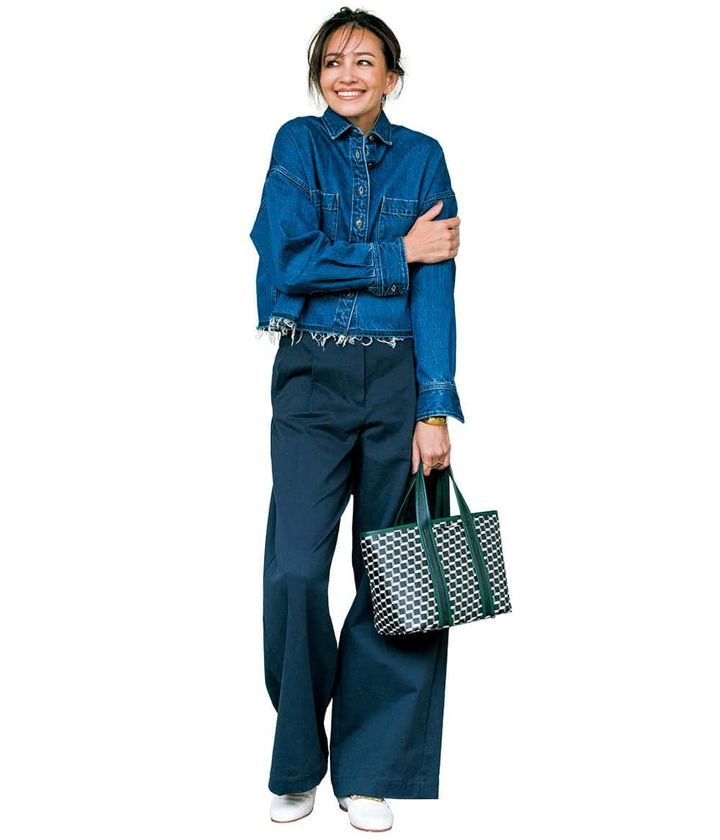 デニムシャツジャケット¥42,900(サクラ/インターリブ)Tシャツ¥9,790(マイストラーダ/マイストラーダ プレスルーム)パンツ¥33,800(テラ/ティースクエア プレスルーム)バッグ¥207,900(ピエール アルディ/ピエール アルディ 東京)シューズ¥135,300(トッズ/トッズ・ジャパン)ベルト¥31,900(RH ヴィンテージ/ロンハーマン)ピアス¥25,300ダブルリング¥40,700(ともにリューク)バングル¥41,580(ソコ/ZUTTOHOLIC)