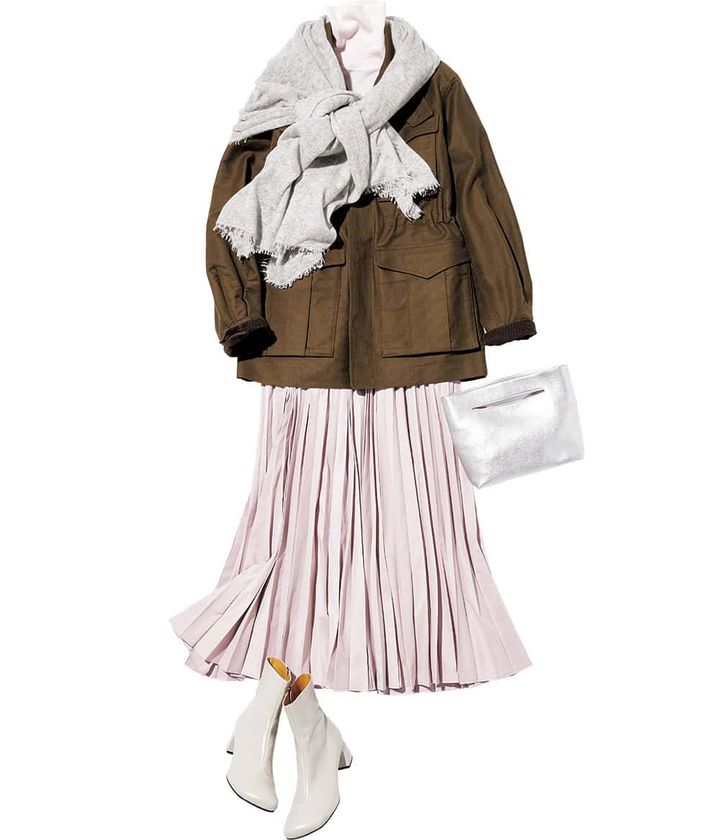 ただでさえ気温の変化に翻弄される秋や冬ですが、立ちはだかるもう一つの敵は風! 強風から身を守れるミリタリージャケットにフェミニンなアイテムを合わせる甘ニッシュな着こなしがオススメです。