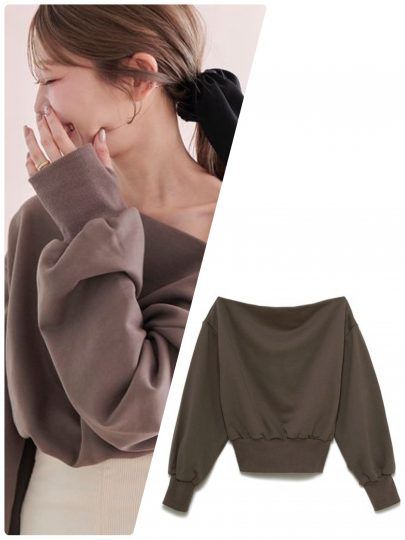 トレンド感のあるオフショルダーデザインが目を惹くスウェットトップス。ホールド感のある仕様なので、ワンショルとしてもオフショルとしても着られる2WAYデザイン。ゆるっとしたボリューム袖と、裾のリブで引き締まるクロップド丈のシルエットが、全体をすっきりと見せてくれます。ブラウンはカジュアルになりすぎず◎