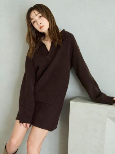 トレンドライクなポロカラーは、あえて深めに設定してほんのり色っぽく着こなせます。