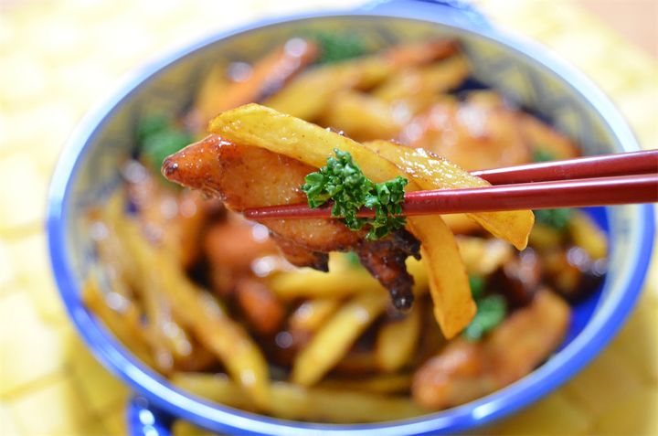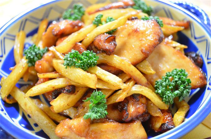 4. 揚げた鶏肉とじゃがいもをフライパンに入れて、[B]を回しかけたらさっと炒める。お皿に移して、パセリを散らせば出来上がり。