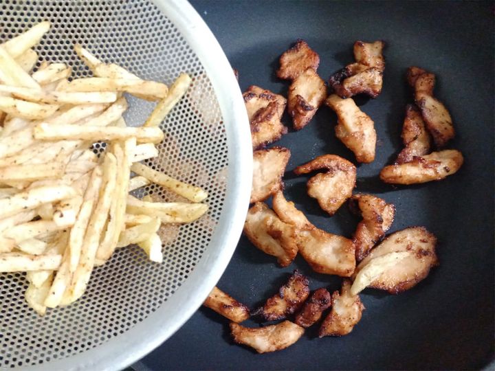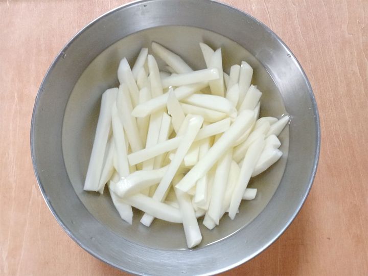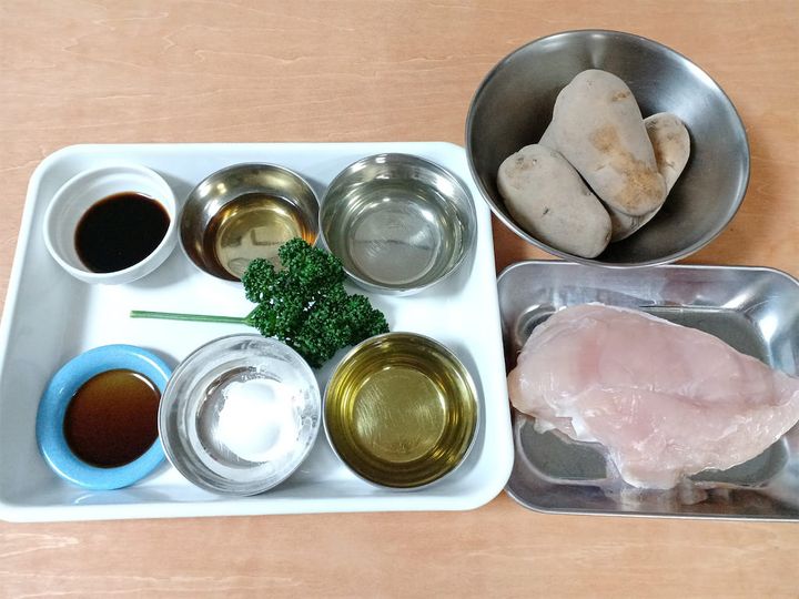 1. 鶏肉を5mmの細切りにし、[A]を入れてよくもみ込む。じゃがいもは皮を剥いて、5mmの細切りにして水に浸けてアクを抜く。