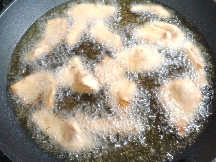 2. 鶏肉に小麦粉をもみ込んで、180℃に熱したこめ油で色が付くまで揚げる。