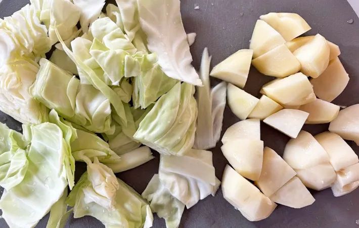 キャベツと皮をむいたジャガイモは一口大に切りましょう。キャベツの芯の部分は、薄切りにすると食べやすいです。