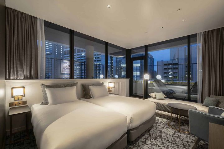 客室は、アールデコ調を現代的にアレンジしたデザインが特徴。ブロンズミラーや水平に広がる窓が、スタイリッシュで落ち着いた雰囲気を演出しています。5階には1室限定のテラス付ツインルームがあり、10階には銀座の夜景を一望できるルーフトップレストラン「BEEF STEAK CLUB KIYO GINZA」が併設上質なステイと美食を一度に楽しめるのが、このホテルの大きな魅力!