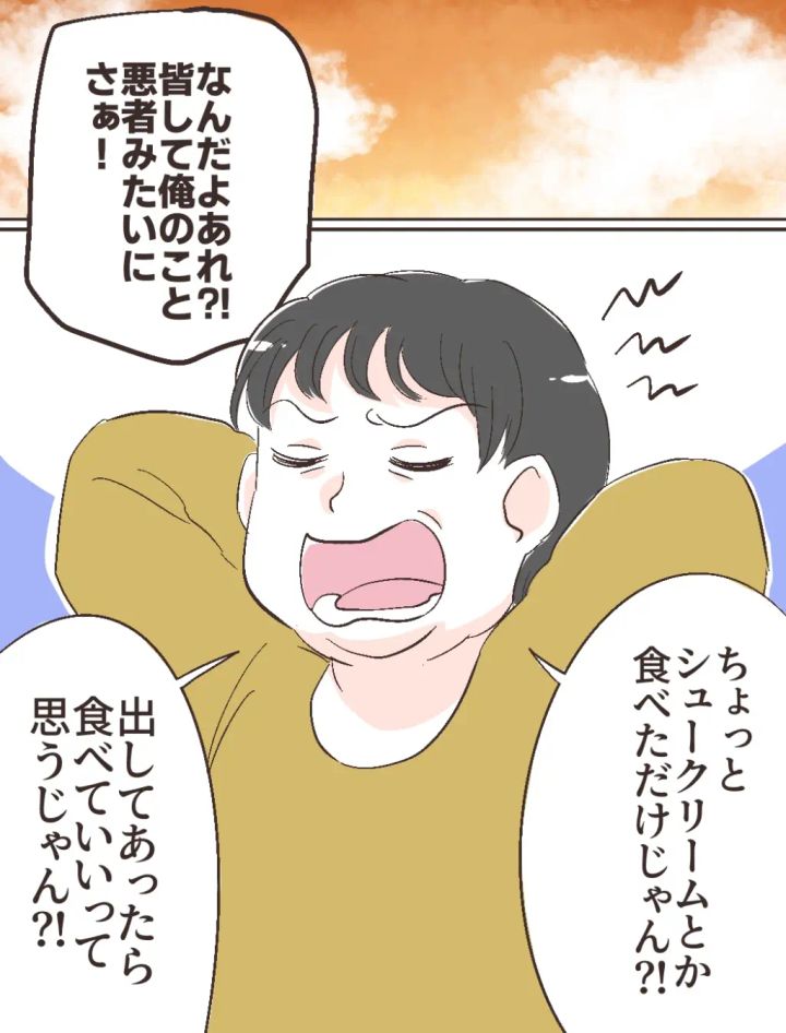 しかし・・。実家から帰ってくると、フトシは「なんだよあれ?!皆して俺のこと悪者みたいにさぁ!ちょっとシュークリーム食べただけじゃん?!出してあったら食べていいって思うじゃん?!」と文句たらたら。ようやく反省したかに見えたフトシでしたが、なぜみんなにあれほど言われたのか全く理解していませんでした。