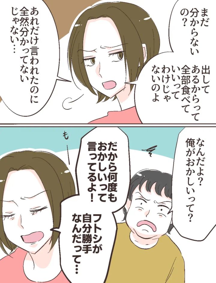 「まだ分からないの?出してあるからって全部食べていいってわけじゃないのよ。あれだけ言われたのに全然分かってないじゃない・・」冷めた口調でそう言うと、「なんだよ?俺がおかしいって?」と苛立つフトシ。「だから何度もおかしいって言ってるよ!フトシが自分勝手なんだって・・」と呆れてしまいました。