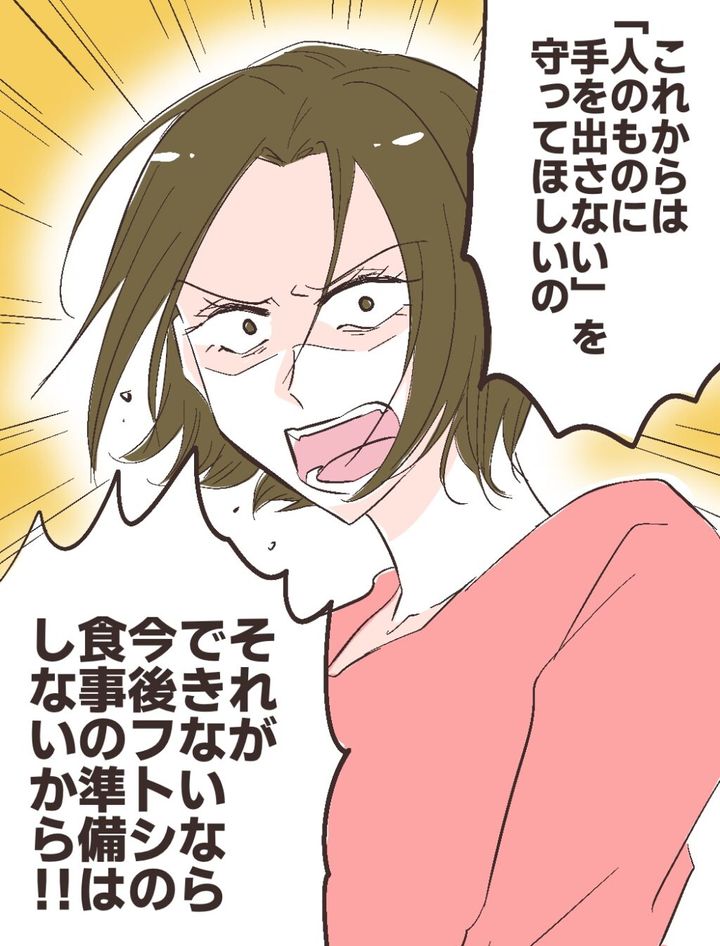 「これからは『人のものに手を出さない』を守ってほしいの。それができないなら今後フトシの食事の準備はしないから!!」どれだけ言っても理解してくれないフトシについにブチ切れた私です。