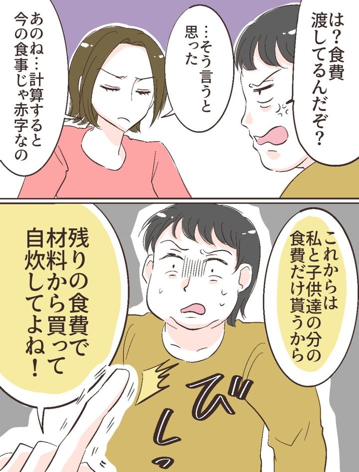 すると「は?食費渡してるんだぞ?」といつものようにお金のことを持ち出してきたフトシ。それでも私は冷静に「・・そう言うと思った。あのね・・計算すると今の食費じゃ赤字なの」と伝え、「これからは私と子ども達の分の食費だけ貰うから、残りの食費で材料から買って自炊してよね!」と強く言い放ちました。