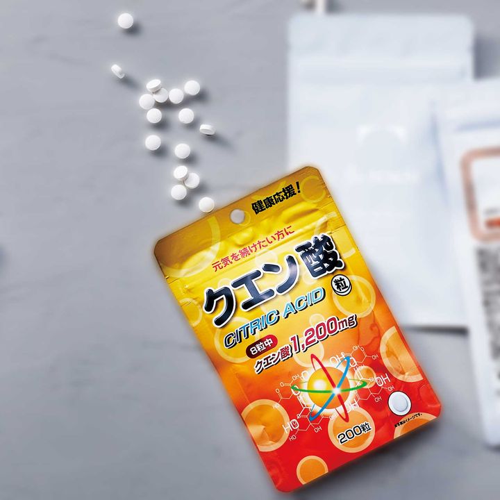 有機酸の一種で柑橘類に含まれるクエン酸。1日8粒でレモン約0.46個分に匹敵。200粒 ¥1,480(ユウキ製薬)