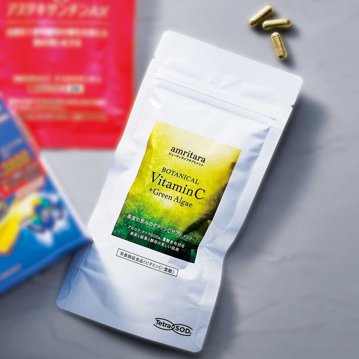 有機アセロラ「ビタミンC」と海洋性緑藻(テトラSOD®)の粉末、酵母由来の葉酸を配合。90粒 ¥3,996(amritara)