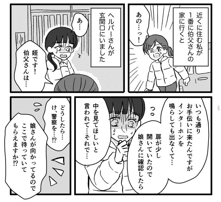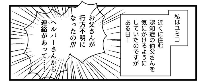 私(ナカノユミコ、40代)は夫(40代)と中学生、小学生の子どもたちと地元で暮らしています。父は亡くなっており、近所の実家では母(マチ、70代)と兄家族が同居中です。伯父(ノブオ、70代、父の兄)も近くで1人暮らしをしているため、遠方に住む従姉妹(アユミ、40代、伯父の娘)に代わって、私や従姉妹の母方の親戚が時々伯父の様子を見に行っていました。しかしある日突然、伯父が行方不明になってしまったのです。