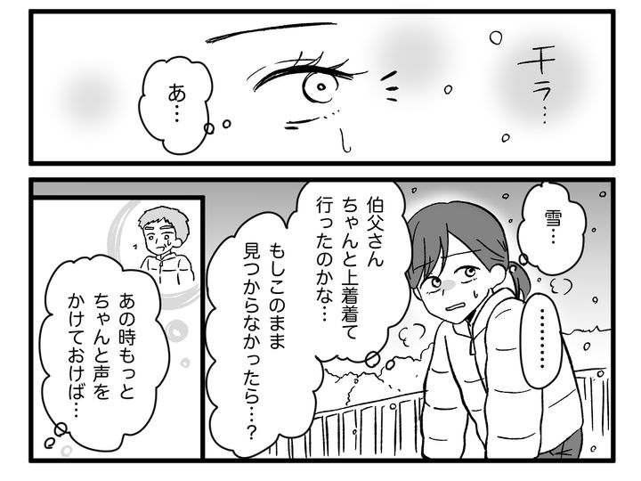 この日は小雪がちらつく寒さです。もしこのまま見つからなかったら……よからぬ想像ばかりが膨らみ、ますます焦ってしまいます。帰りたくても帰れず、寒いなか1人でさまよっている伯父を想像すると、胸が締めつけられる思いで、涙が出てきました。