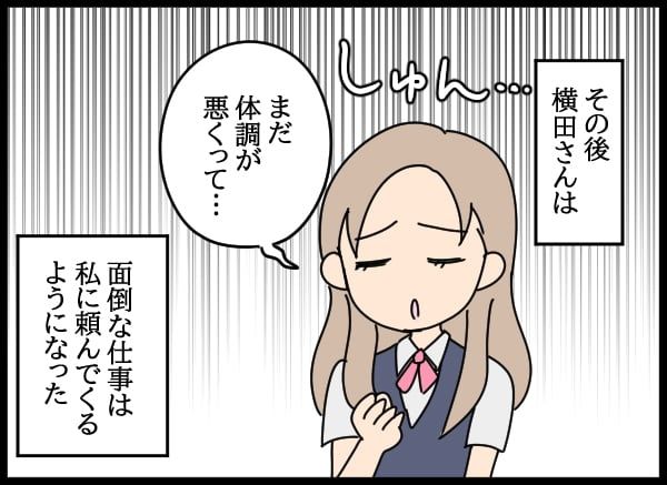 前の話を読む。横田は体調不良を言い訳に仕事をサトコに押し付けて早退する。サトコは残業して引き継いだ仕事を終えるが後輩の小野は横田がわざとやったと勘づく。