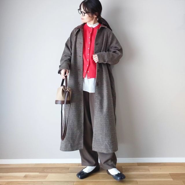 こんな柄コートを取り入れれば、同じ色のワントーンコーデも地味見えせずにおしゃれに見えます。今季人気のブラウンでアウターとボトムスを統一したら、インナーの赤でさらにアクセントを加えてクラスアップ!