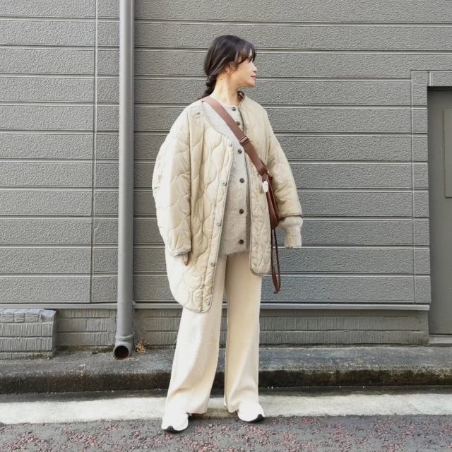 次にご紹介するのは、素材感の違いでスタイリングの奥行きをアップするテクニックです。スナップのようなキルティングアウターは、コーデに立体感をプラスして冬の着こなしをおしゃれに見せる優秀アイテム。スムースなパンツやスカートとのコントラストが生まれ、同じ色でも奥行きたっぷりに仕上がります。